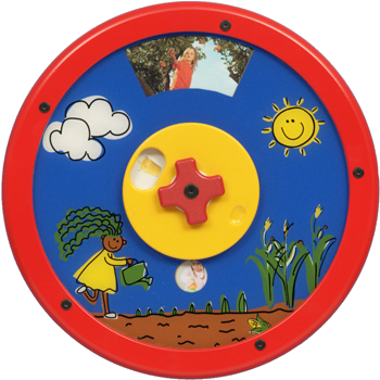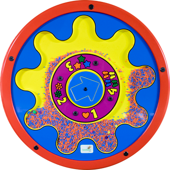 前面のスピナーを回して、見つけ出すアイテムの数を決定します。次にビーズを「ふるい分け」て、探している正しいアイテムを見つけ出します。数字や順序などの決まりを理解しながら遊ぶパネルです。 -